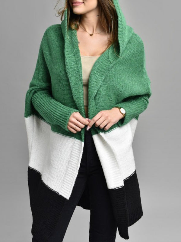 Spring And Autumn Classic Splicing Color Knitted Sweater Cardigan Women's Fashion Hooded Loose Casual Coat HZ1208