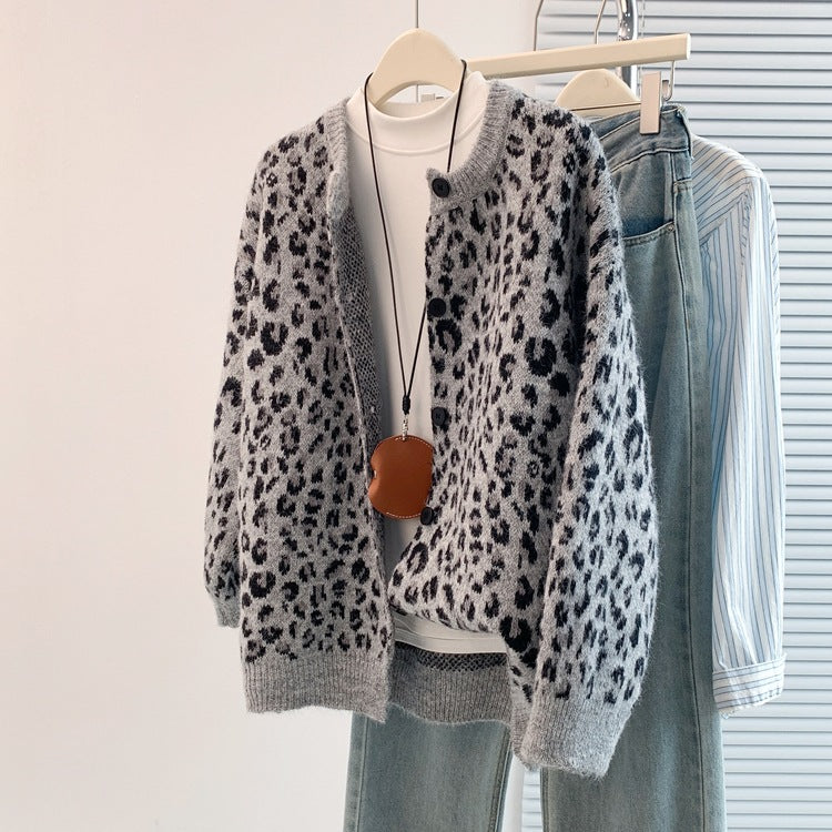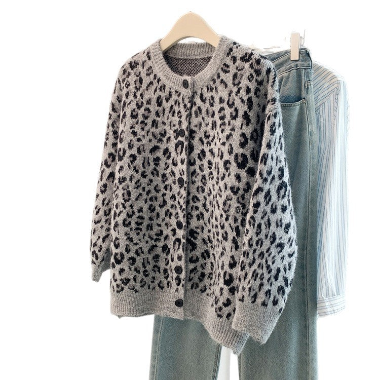 Large-Size European Version Of Retro Lazy Chic Leopard Single-Rower Buckle 2025 Knitted Cardigan Sweater Coat Women's Clothing HZ1208