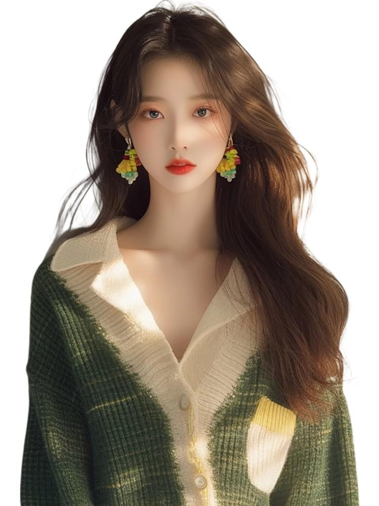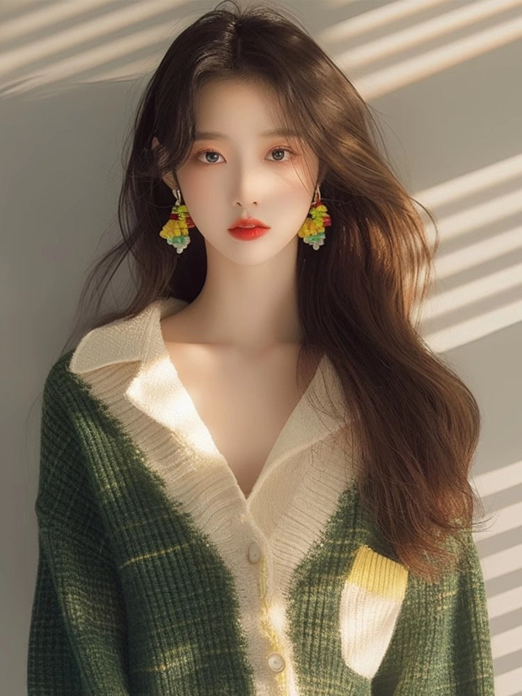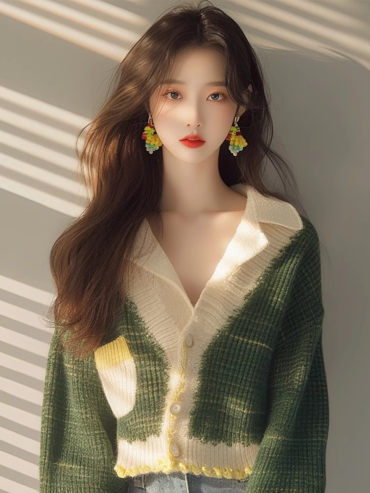 This Year's Popular Beautiful Little Shirt Small Man Fashionable Loose Thin Green V Collar Knit Long Sleeve Open Shirt Woman HZ1208