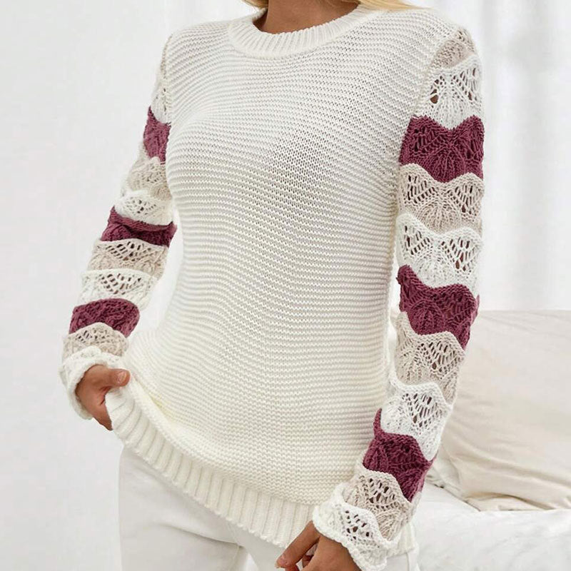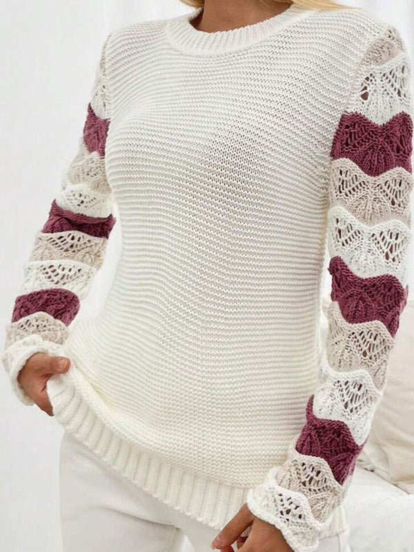 Autumn And Winter New Sweater Women's Knitted Stripes Hit The Hollow Sleeve Round Collar Coat HZ1208