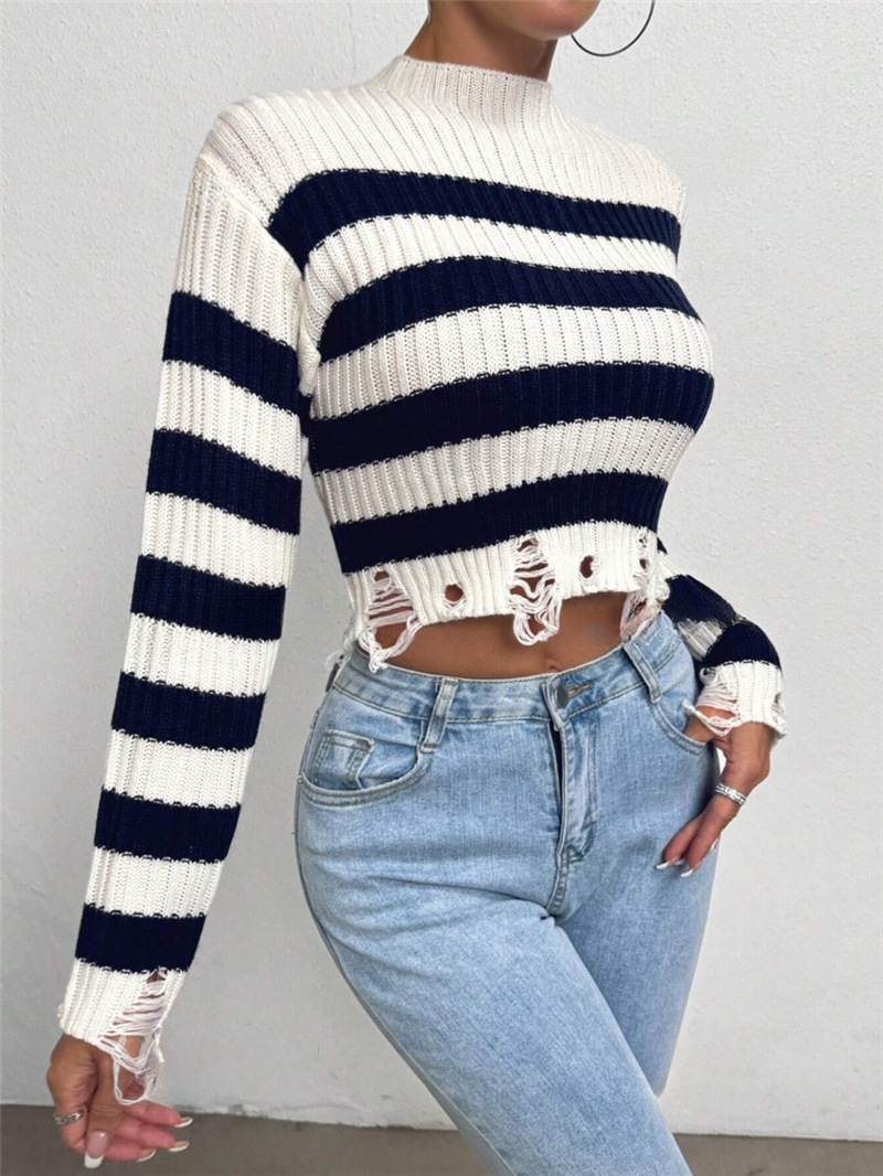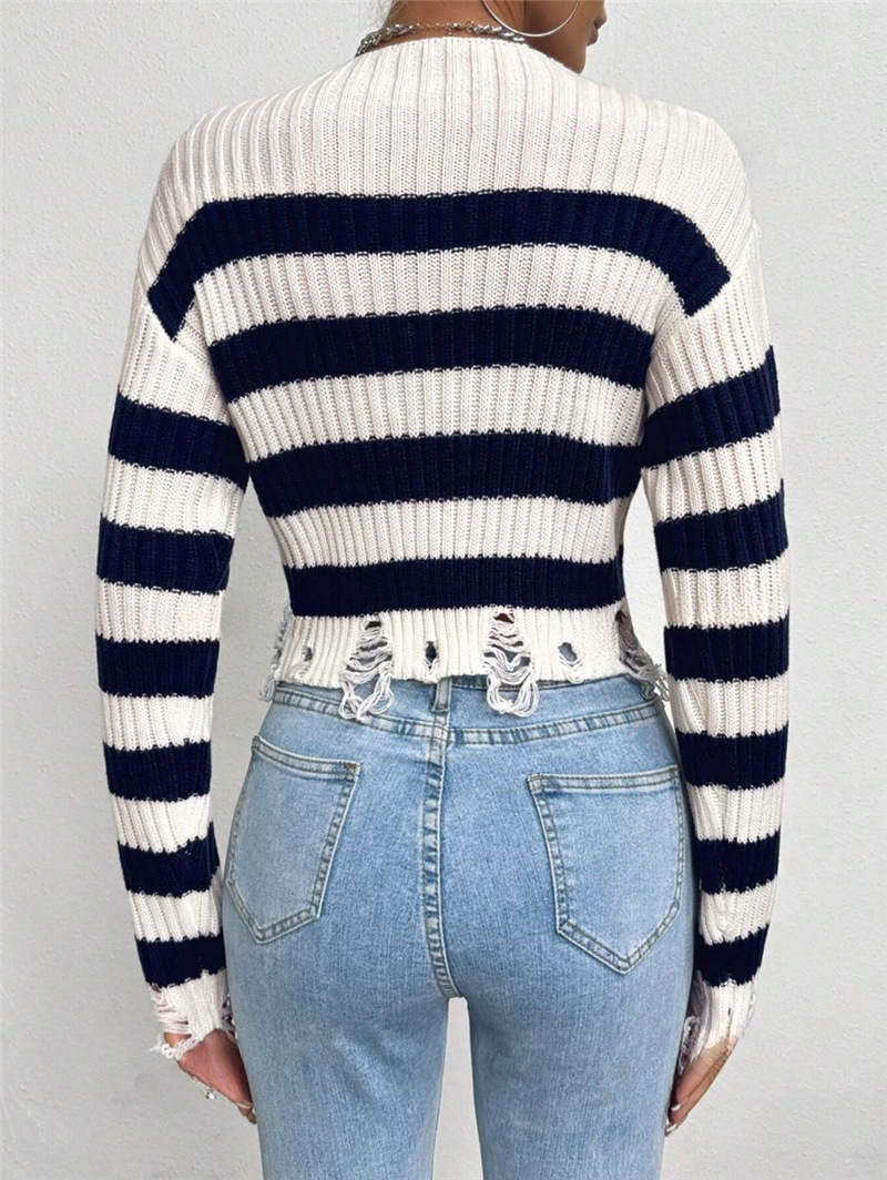 Women's Clothing Fashion Round Collar High-Waist Short Striped Knitted Short Sweater HZ1208