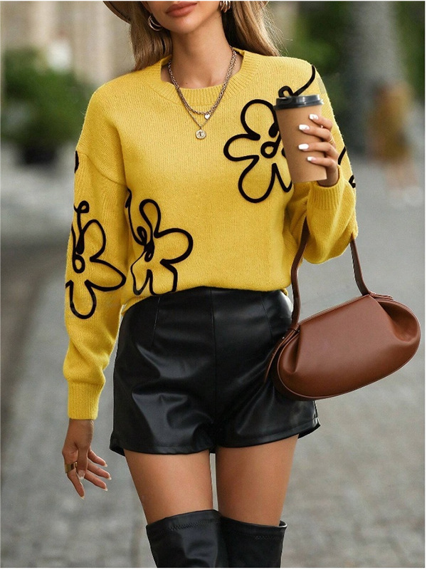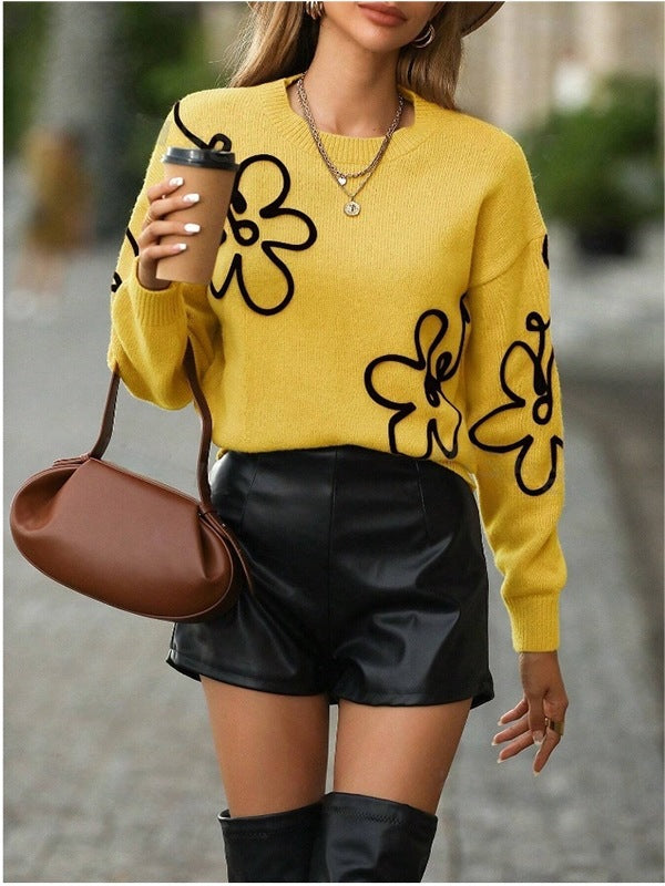 Women's Spring And Autumn Solid-Colored Flowers Knitted Sweater Fashion Collar Long-Sleeved Top HZ1208